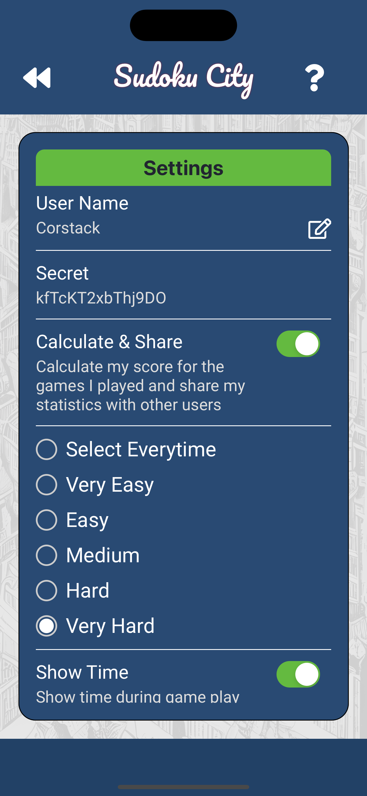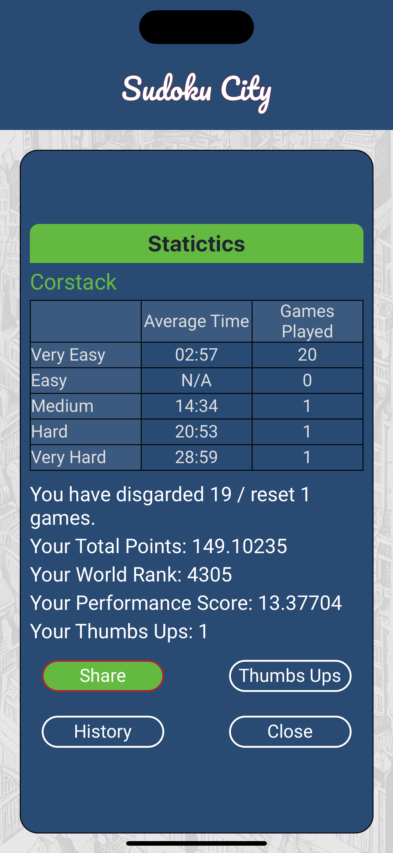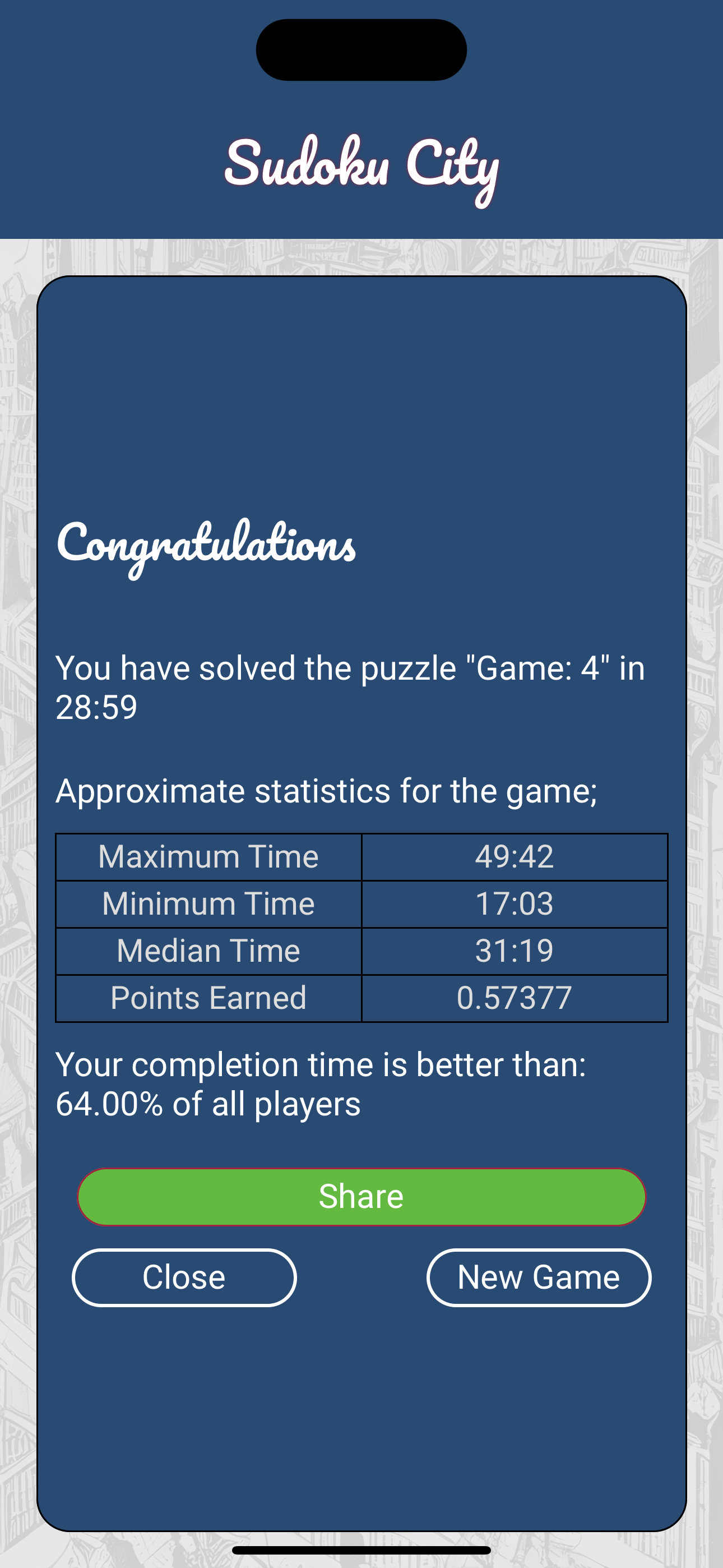 Sudoku City is a puzzle game based on Sudoku. Players are able to compare themselves with other players' results via z-score calculation. There are five levels of difficulty for players to choose the one suits them. Players can congratulate other players' results and get congratulation form other players.