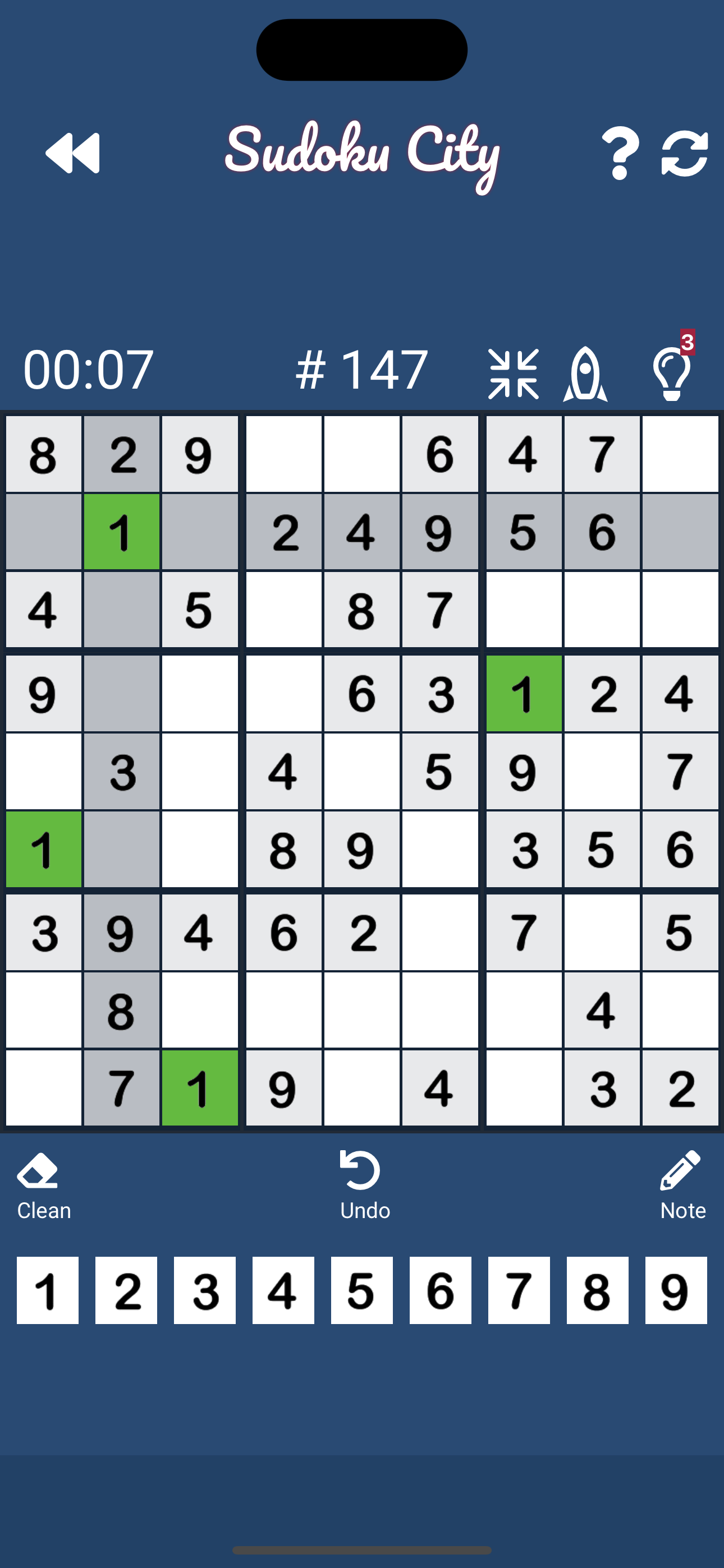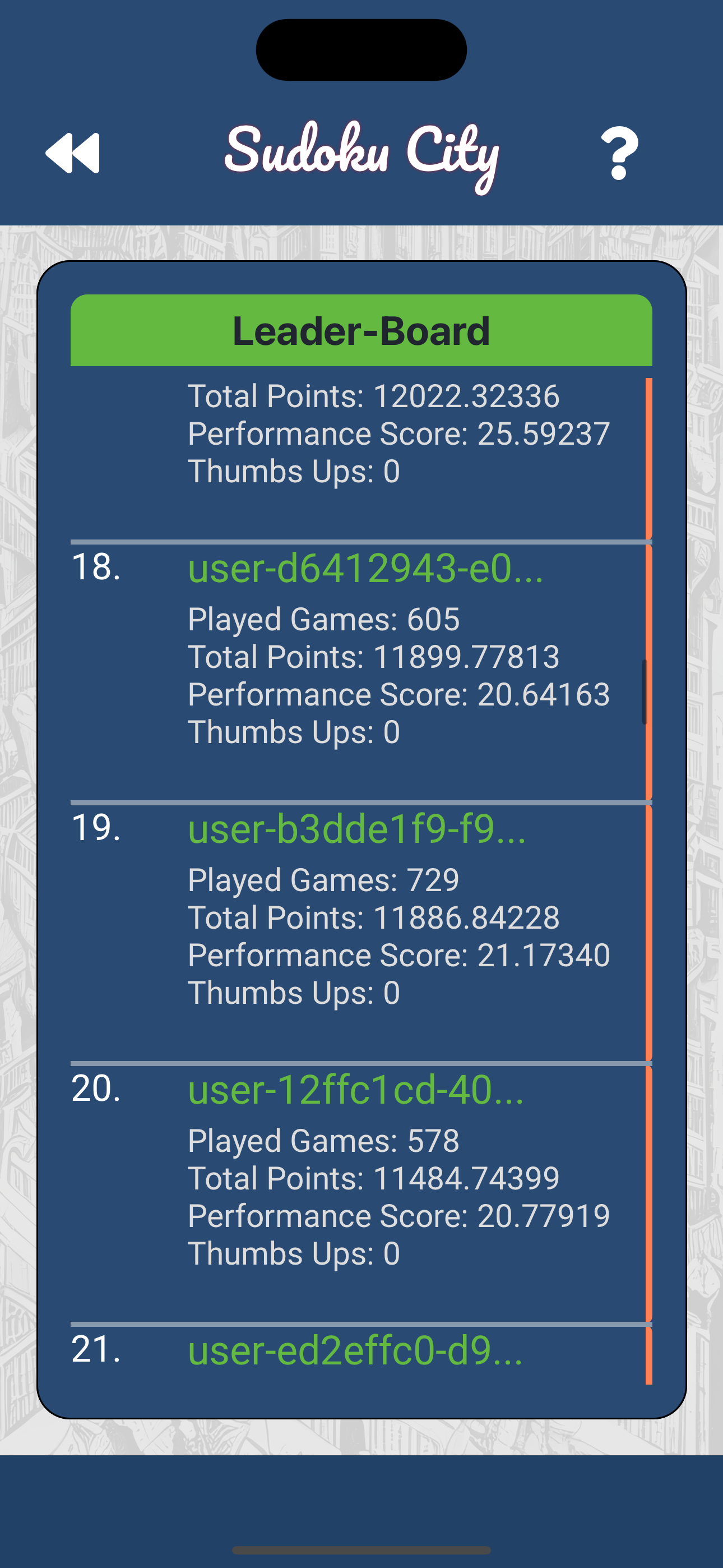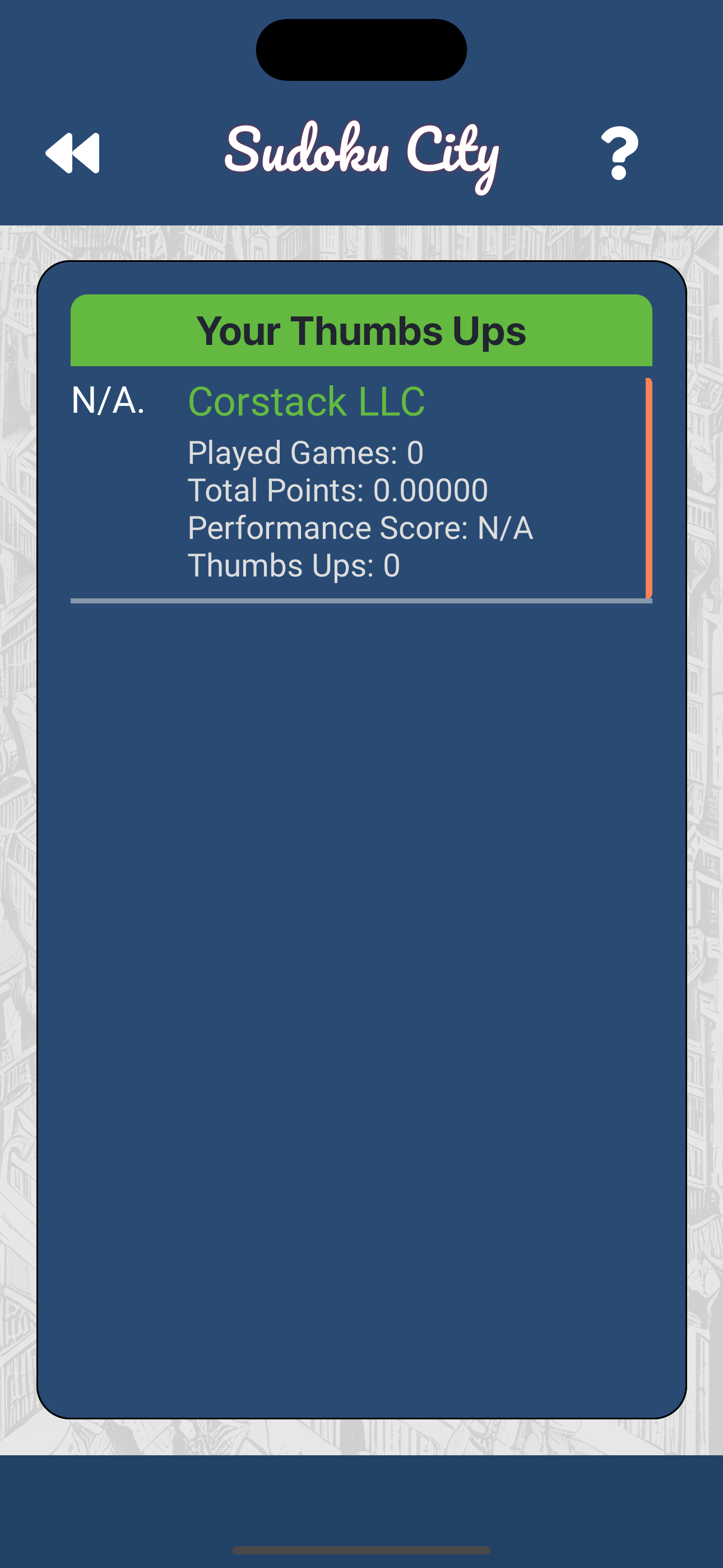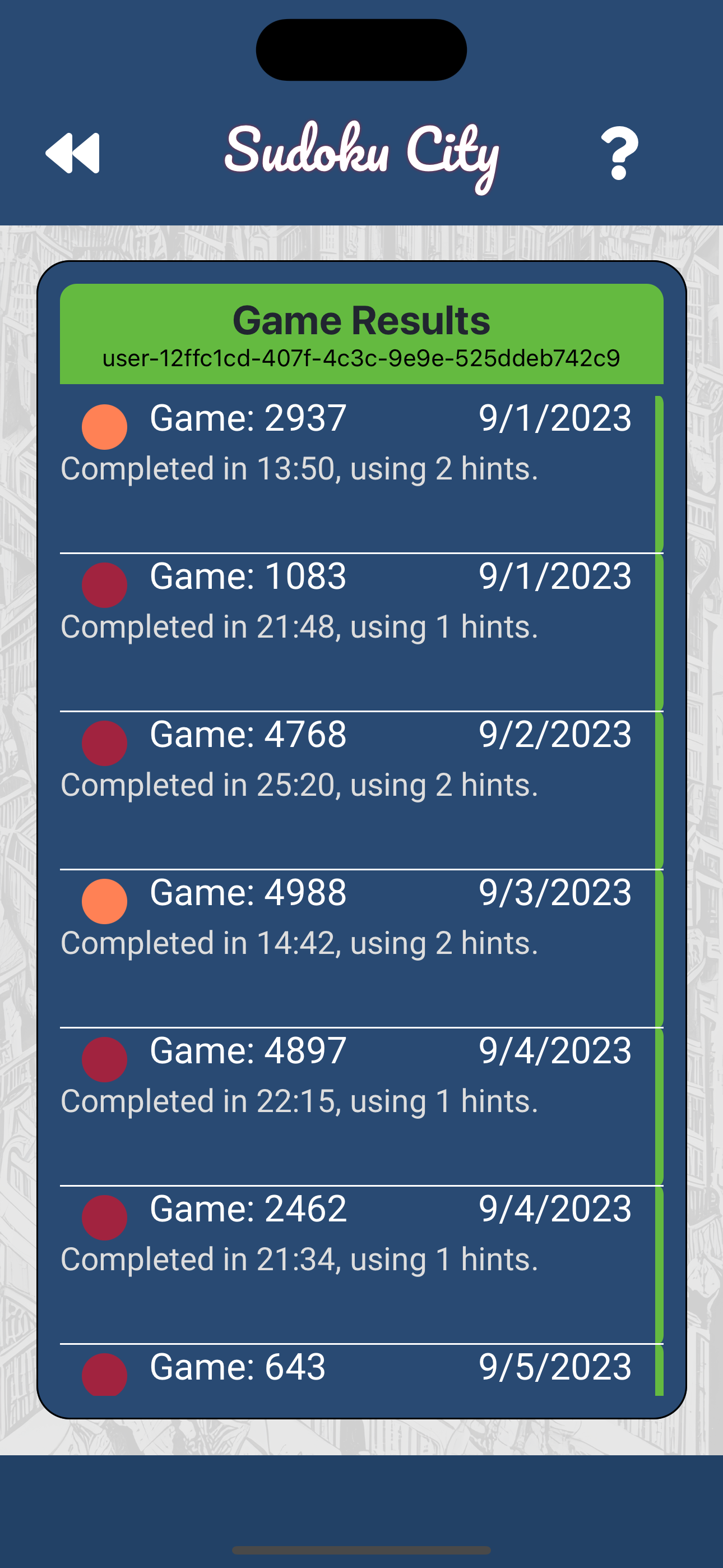 Sudoku City is a puzzle game based on Sudoku. Players are able to compare themselves with other players' results via z-score calculation. There are five levels of difficulty for players to choose the one suits them. Players can congratulate other players' results and get congratulation form other players.